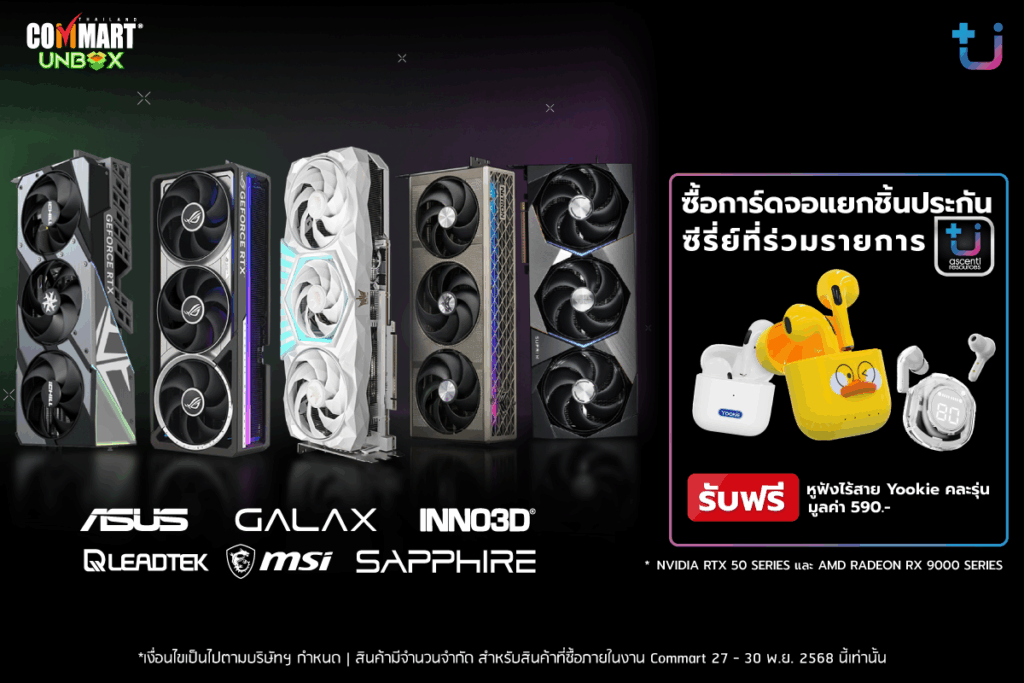 สานต่อแคมเปญสุดร้อนแรงในรอบที่แล้ว อีกหนึ่งไฮไลท์สำหรับใครที่จะอัพเกรดการ์ดจอโดยเฉพาะ! เมื่อคุณเลือกซื้อการ์ดจอรุ่นใดก็ได้ภายในงาน ที่รับประกันโดย Ascenti ไม่ว่าจะเป็น ASUS / GALAX / INNO3D / Leadtek / MSI / Sapphire รับของแถมสุดเอ็กซ์คลูซีฟทันที! หูฟังไร้สาย Yookie True Wireless มูลค่า 590 บาท เฉพาะที่งาน COMMART UNBOX เท่านั้น — ของมีจำนวนจำกัด หมดแล้วหมดเลย!