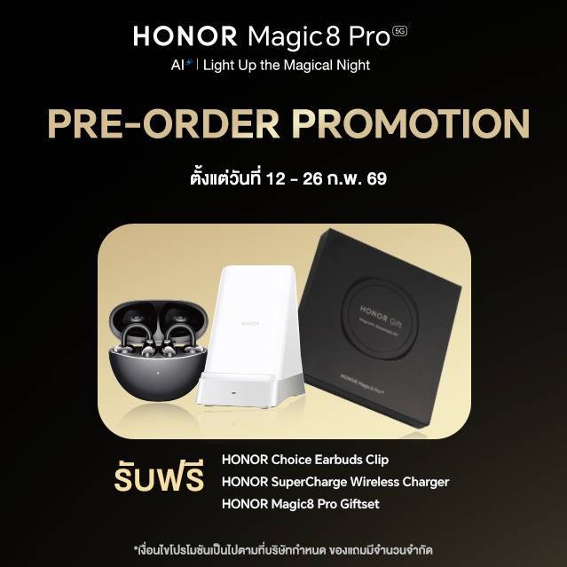 11 กุมภาพันธ์ 2569, กรุงเทพฯ – ออเนอร์ (HONOR) ผู้ให้บริการอุปกรณ์อัจฉริยะชั้นนำระดับโลก เปิดตัว HONOR Magic8 Pro อย่างเป็นทางการในประเทศไทย สมาร์ตโฟนแฟลกชิปรุ่นล่าสุดภายใต้คอนเซปต์ “AI Light Up the Magical Night” ชูจุดเด่นด้านการถ่ายภาพด้วยกล้องเทเลโฟโต้ 200MP Ultra Night ที่ยกระดับการถ่ายภาพกลางคืนให้คมชัดในทุกมิติ ผสานพลัง AI Magic Color ถ่ายทอดแสง สี และอารมณ์ของยามค่ำคืนได้อย่างสมจริง เสริมประสิทธิภาพการใช้งานด้วยชิปเซ็ตเรือธง Snapdragon 8 Elite Gen 5 และแบตเตอรี่ขนาดใหญ่ 7,100mAh ตอบโจทย์ทั้งความเร็ว แรง และการใช้งานต่อเนื่องยาวนาน พร้อมก้าวขึ้นเป็นมาตรฐานใหม่ของสมาร์ตโฟนกล้อง AI ระดับพรีเมียม จำหน่ายในราคา 39,990 บาท เปิดให้พรีออเดอร์ระหว่างวันที่ 12–26 กุมภาพันธ์ 2569 รับของแถมและข้อเสนอพิเศษมากมาย เริ่มจำหน่ายอย่างเป็นทางการตั้งแต่ 27 กุมภาพันธ์ 2569 เป็นต้นไป
