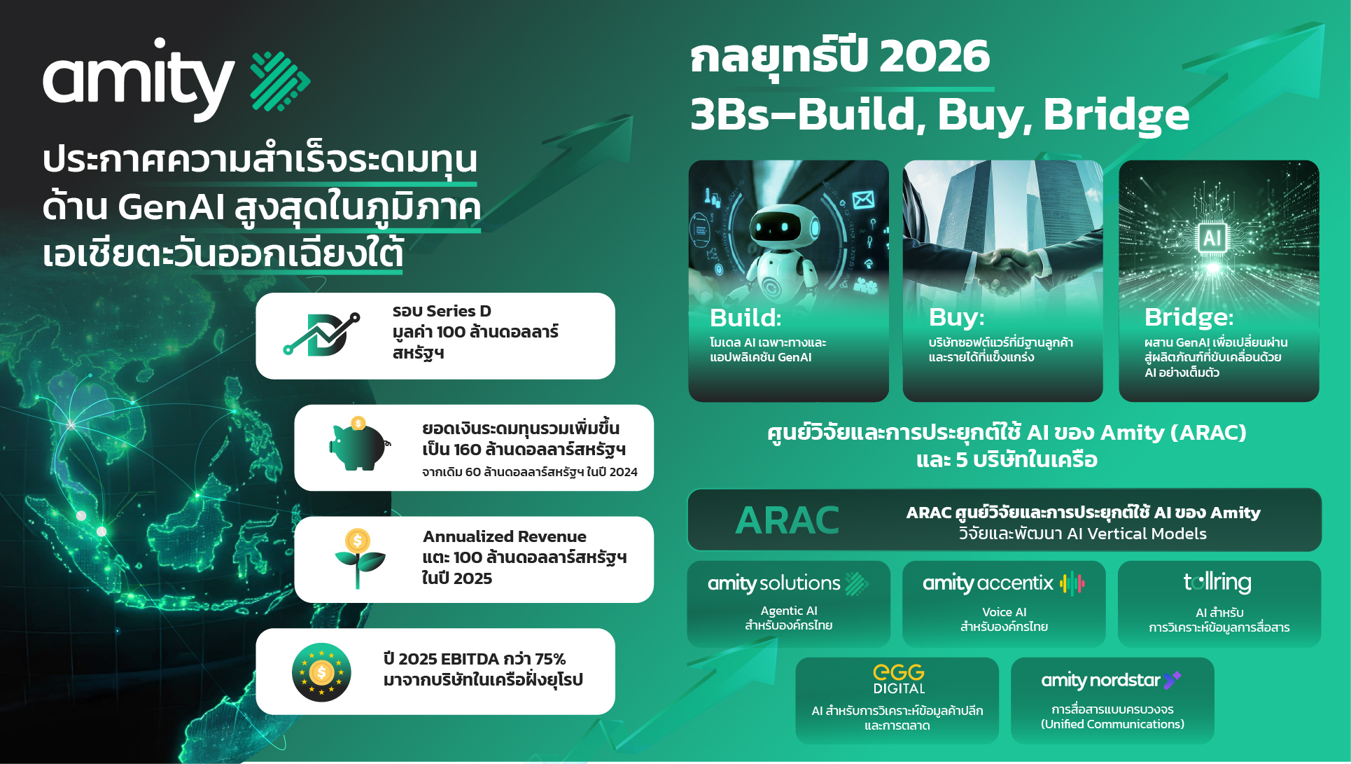 อะมิตี้ขับเคลื่อนการเติบโตด้วยกลยุทธ์ “3Bs – Build, Buy, Bridge” ได้แก่Build- การพัฒนาขีดความสามารถด้านAI ผ่านARAC,Buy- การขยายธุรกิจผ่านการควบรวมและเข้าซื้อกิจการในเอเชียตะวันออกเฉียงใต้และยุโรปและBridge– การผสานและบูรณาการศักยภาพของบริษัทในเครือเข้าด้วยกันเพื่อเร่งต่อยอดโซลูชันAI สำหรับองค์กรสู่การนำไปใช้ได้จริงในเชิงพาณิชย์พร้อมตอกย้ำความแข็งแกร่งในฐานะผู้นำด้านAI ระดับภูมิภาคที่กำลังเติบโตสู่เวทีโลก