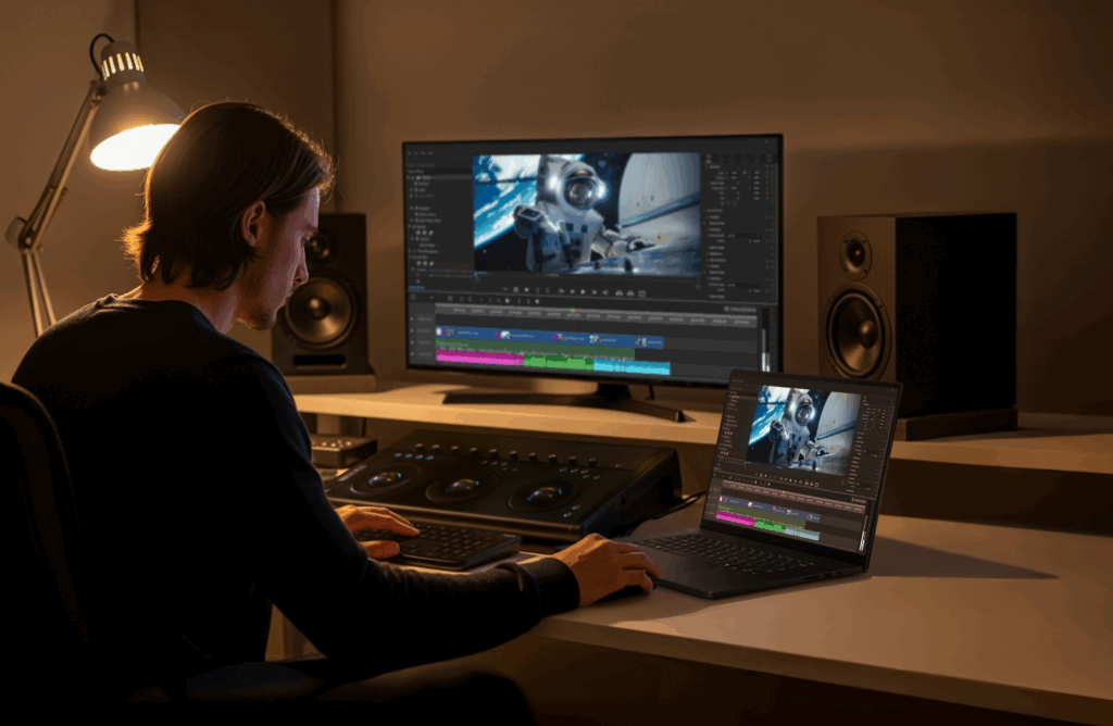 ProArt P16 ผสานทุกสิ่งที่ครีเอเตอร์ต้องการไว้ในโซลูชันที่ทรงพลังและออกแบบมาโดยเฉพาะสำหรับสายสร้างสรรค์ ด้วยการ์ดจอล่าสุด NVIDIA GeForce RTX 5090 Laptop นับเป็นก้าวกระโดดของวงการตัดต่อวีดีโอ มอบทั้งความเร็วและเสถียรภาพที่ไร้เทียมทาน รองรับสีแบบ 10-bit 4:2:2 การเข้ารหัส/ถอดรหัสวิดีโอ 4K/8K ได้อย่างรวดเร็ว การประมวลผลเอฟเฟกต์ AI อันทรงพลังยังช่วยเร่งงานอย่างเช่น การลดนอยส์, การอัปสเกลภาพ และการตรวจจับฉากอัตโนมัติ ทำให้ลดภาระงานของเหล่าครีเอเตอร์ได้อย่างมาก หน่วยความจำกราฟิก (VRAM) ขนาดใหญ่ยังช่วยให้จัดการกับไฟล์ขนาดใหญ่และองค์ประกอบที่ซับซ้อนได้อย่างราบรื่น ไม่มีสะดุดหรือเฟรมตก ในขณะที่โหมด AV1 Ultra High Quality ก็ช่วยให้การบีบอัดไฟล์มีประสิทธิภาพมากขึ้นโดยไม่ลดคุณภาพของภาพ