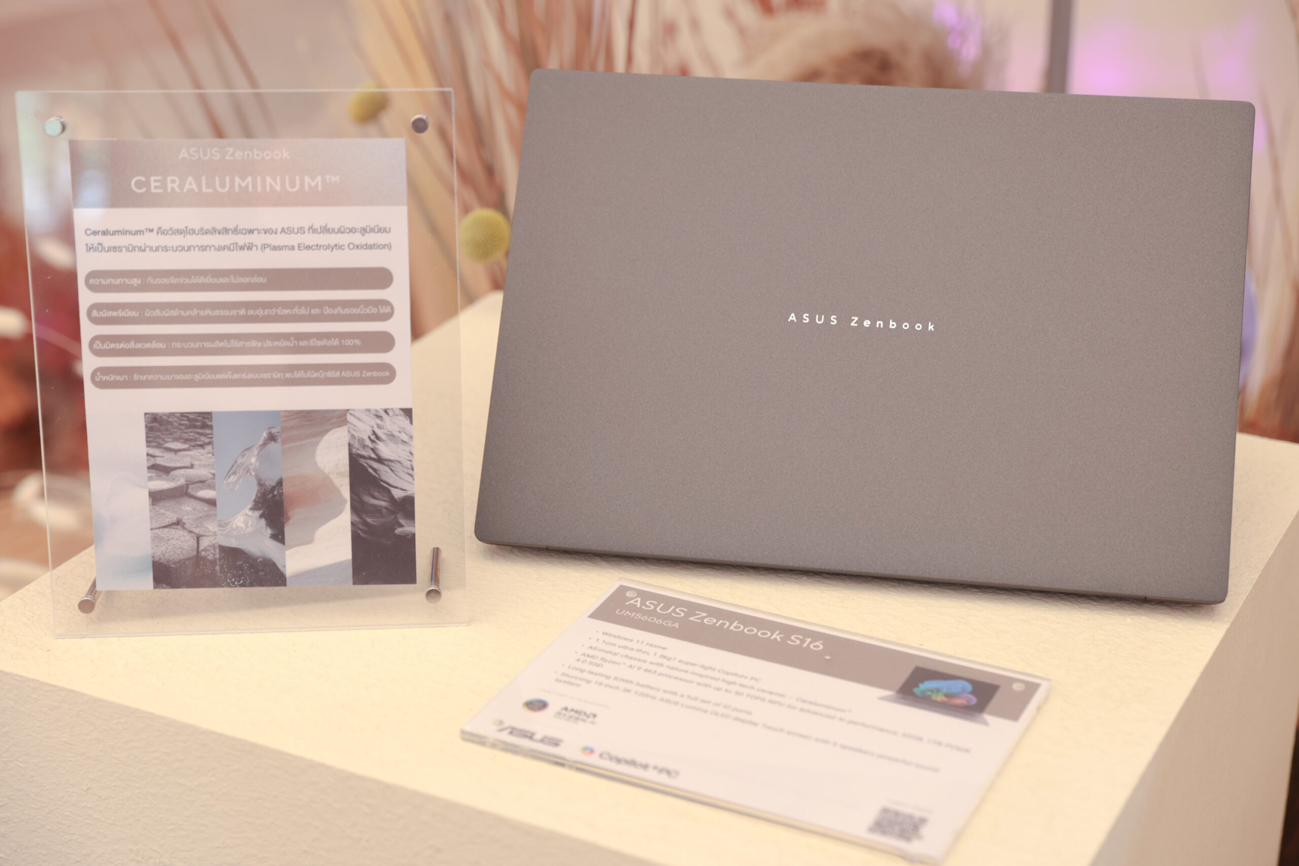 สำหรับโน้ตบุ๊กกลุ่ม Zenbook S ที่เปิดตัวในงาน นำโดย ASUS Zenbook S16 (UM5606GA) มาพร้อมดีไซน์ฝาหน้าโฉมใหม่ ประจำปี 2026 เพิ่มเอกลักษณ์ด้วยโลโก้ Zenbook ดีไซน์ใหม่ และสีใหม่ Antrim Gray (เทา) ที่ช่วยเสริมภาพลักษณ์ให้ดูทั นสมัย เรียบหรูในสไตล์มินิมอลแบบลงตัว ให้ความพรีเมียมด้วยวัสดุพิ เศษเฉพาะ ‘เซราลูมิเนียม’ (Ceraluminum™) ซึ่งเป็ นการผสมผสานความสวยงามและสัมผั สของเซรามิกเข้ากับความแข็งแกร่ งของอะลูมิเนียม ให้ความทนทาน ลดการเกิดรอยนิ้วมือ และความรู้สึกพิเศษเมื่อเทียบกั บอะลูมิเนียมทั่วไป พร้อมคงไว้ซึ่งความแข็ งแรงของโครงสร้างและความคล่องตั ว มาพร้อมโปรเซสเซอร์ AMD Ryzen™ AI 9 465 พร้อมชิป NPU ประมวลผล AI ได้กว่า 50 TOPS เหมาะสำหรับไลฟ์สไตล์คนทำงานที่ เน้นการพกพา ตัวเครื่องบางเฉียบเพียง 1.1 ซม. น้ำหนัก 1.5 กิโลกรัม โดยยังมาพร้อมแบตเตอรี่ขนาด 83Wh ใช้งานได้ยาวนานยิ่งขึ้น