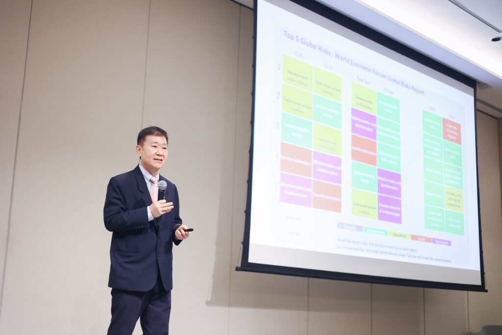 ศาสตราจารย์ ดร.อรัญ หาญสืบสาย ภาควิชาเทคโนโลยีทางภาพและการพิ มพ์ จุฬาลงกรณ์มหาวิทยาลัย ได้ร่วมนำเสนอข้อมูลภายในงานว่า “อุตสาหกรรมการพิมพ์ในปี 2569 ต้องเผชิญความท้าทายรอบด้าน ทั้งความขัดแย้งทางภูมิเศรษฐกิ จที่ World Economic Forum จัดอันดับให้เป็นความเสี่ยงระดั บโลกอันดับ 1 การหยุดชะงักของห่วงโซ่อุปทาน ต้นทุนที่สูงขึ้น และพฤติกรรมผู้บริโภคที่เปลี่ ยนไปสู่งานพิมพ์จำนวนน้อยและมี รูปแบบเฉพาะกลุ่มมากขึ้น