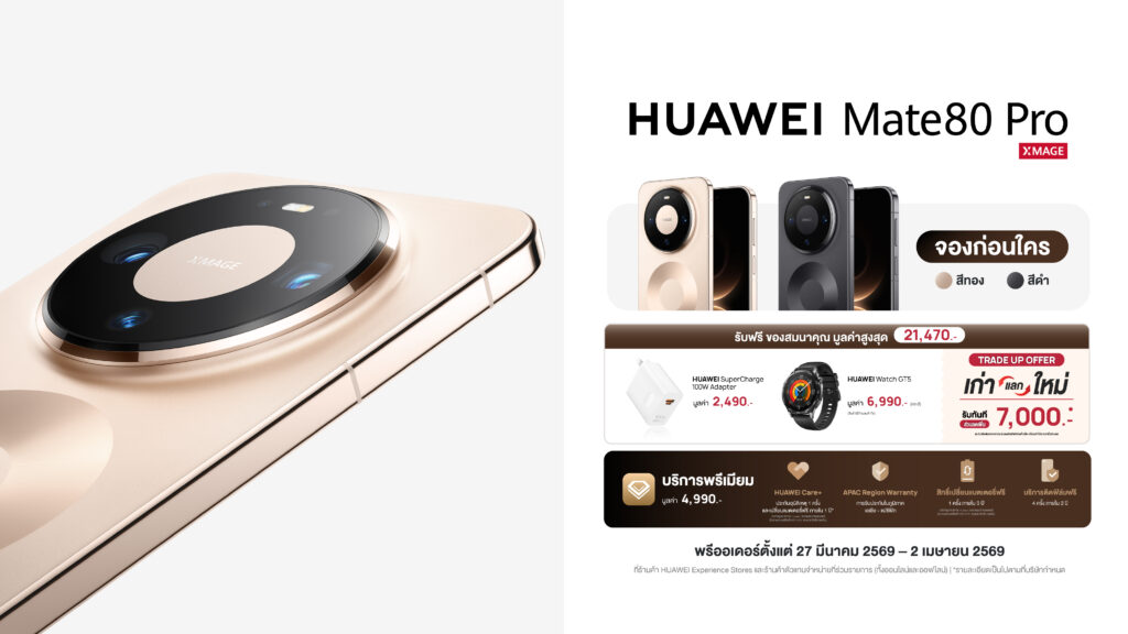 กรุงเทพฯ 24 มีนาคม 2569 – หลังจากสร้างชื่อในฐานะสมาร์ทโฟนเรือธงที่เป็นผู้นำด้านนวัตกรรมของหัวเว่ยมาอย่างต่อเนื่อง วันนี้ HUAWEI Mate Series พร้อมกลับมาสร้างประวัติศาสตร์ครั้งใหม่กับ HUAWEI Mate 80 Pro ที่หลายคนต่างจับตาด้วย 3 เหตุผลสำคัญ ทั้งการสานต่อแนวคิด “See It True” ถ่ายทอดโลกและสีสันรอบตัวได้อย่างสมจริงดุจตาเห็น พร้อมยกระดับประสบการณ์สมาร์ทโฟนในทุกมิติ ทั้งระบบกล้องที่ให้สีสันแม่นยำไร้ที่ติ ความแข็งแกร่งทนทานเหนือระดับ และขีดความสามารถด้าน AI อัจฉริยะ ที่จะช่วยให้การถ่ายภาพและการใช้งานในชีวิตประจำวันของคุณง่ายและชาญฉลาดยิ่งขึ้น