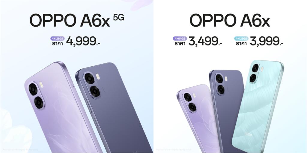 - OPPO A6x 5G (4+128GB) มาใน 2 สี ได้แก่ สีม่วง Violet Purple และสีม่วง Plum Purple วางจำหน่ายในราคา 4,999 บาท