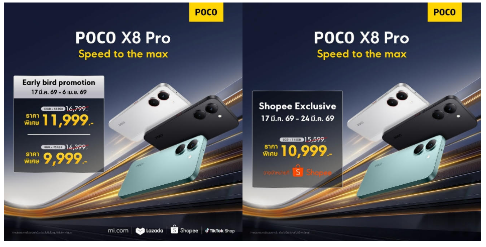 • POCO X8 Pro รุ่นความจุ 8GB+512GB วางจำหน่ายในราคาพิเศษ 10,99938 (จากราคาปกติ 15,599 บาท) ตั้งแต่วันนี้ ถึง 24 มีนาคม 2569 เฉพาะที่ Shopee เท่านั้น38