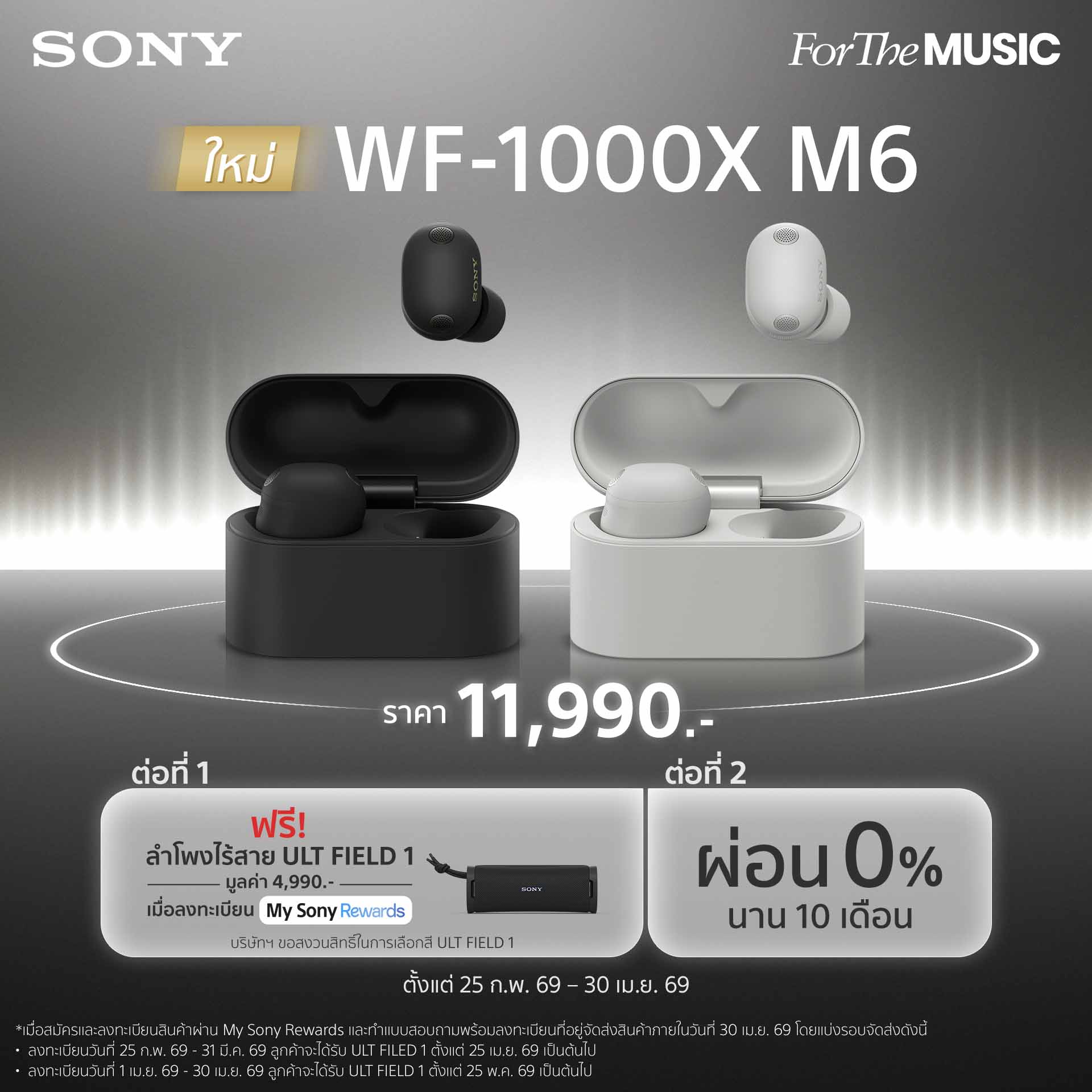 WF-1000XM6พร้อมวางจำหน่ายอย่างเป็นทางการตั้งแต่วันที่25กุมภาพันธ์2569ในราคา11,990บาท โดยมีให้เลือกทั้งหมด2สีได้แก่สีดำ (Black) และสีแพลตตินัมซิลเวอร์ (Platinum Silver) พร้อมโปรโมชั่นพิเศษรับฟรีลำโพงพกพาโซนี่ULT FIELD 1มูลค่า4,990บาทเมื่อซื้อหูฟังWF-1000XM6และลงทะเบียนรับประกันสินค้าMy Sony ผ่านไลน์@SonyThaiพร้อมตอบแบบสอบถามที่จะได้รับทางอีเมลหลังการลงทะเบียนรับประกันสินค้าภายในวันเดียวกันตั้งแต่วันที่25กุมภาพันธ์2569 – 30เมษายน2569