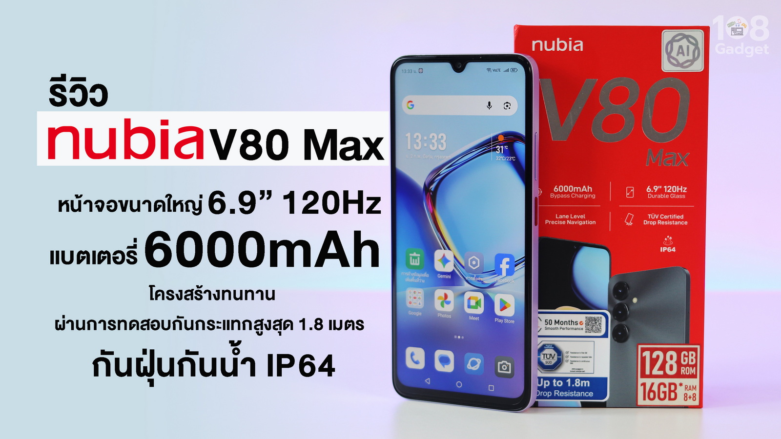 nubia V80 Max สมาร์ตโฟนระดับเริ่มต้น (Entry-level) ตัวคุ้มในงบไม่เกินสี่พันบาท ที่มาพร้อมกับหน้าจอขนาดใหญ่ 6.9 นิ้ว HD+ 120Hz เหมาะกับการชมคอนเท็นต่างๆ สามารถใช้งานได้ยาวนานกับแบตเตอรี่ความจุ 6000mAh ถึงจะเป็นสมาร์ตโฟนระดับเริ่มต้นแต่ทำงานได้ไหลลื่นกับชิปประมวลผล CPU Unisoc T7250 หน่วยความจำ RAM 8 GB / ROM 128 GB รองรับเพิ่มหน่วยความจำภายนอกแบบ MicroSD Card สูงสุด 1TB เอาใจสายลุยสายโหดกับโครงสร้างภายในตัวเครื่องทนต่อแรงตกกระแทกได้สูงถึง 1.8 เมตร ผ่านมาตราฐานกันฝุ่นกันน้ำ IP64 ทั้งหมดนี้กับค่าตัวเบาๆเพียง 3,999 บาท