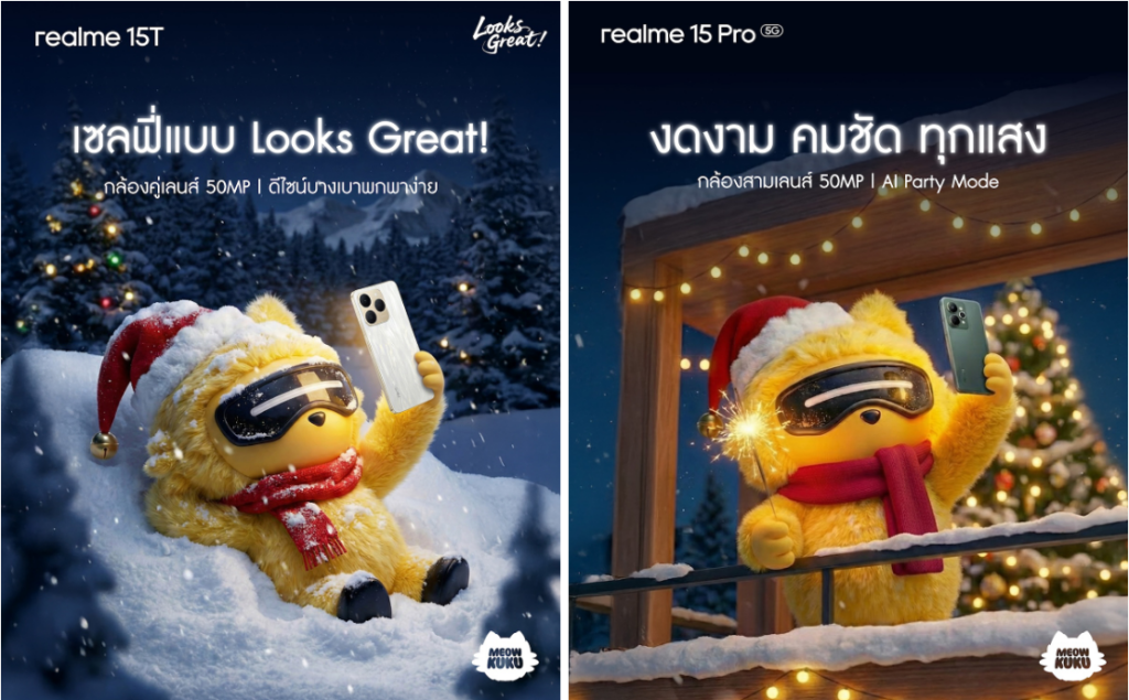 โดยเฉพาะ realme 15 Series 5G ที่ขึ้นแท่นเป็น AI Party Phone เก็บภาพสวยทั้งกลางวันและกลางคืนด้วย AI Party Mode พร้อมกล้องความละเอียด 50MP และถ่ายวิดีโอความละเอียด 4K ได้ทั้งกล้องหน้าและหลัง ช่วยให้ทุกโมเมนต์ของคุณพร้อมแชร์ในคุณภาพระดับโปร