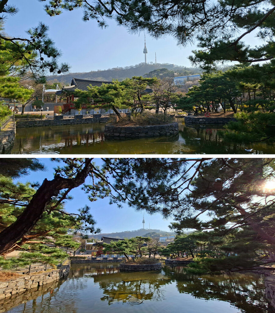 (จากบนลงล่าง) ภาพบรรยากาศยามค่ำคืนในกรุงโซลที่ถ่ายด้วยฟีเจอร์ Nightography บน Galaxy A57 5G และภาพผลลัพธ์ที่ได้
