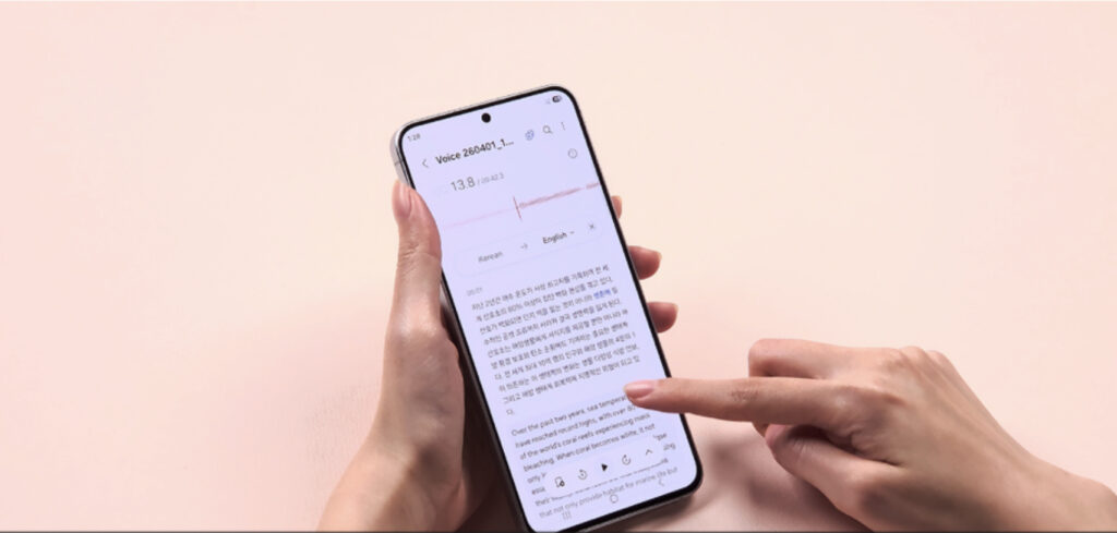 หนึ่งในฟีเจอร์ใหม่ที่โดดเด่น คือ Voice Transcription ซึ่งพร้อมใช้งานบน Galaxy A Series เป็นครั้งแรก โดยผู้ใช้งานสามารถบันทึกเสียงผ่านแอป Voice Recorder พร้อมแปลงเสียงพูดเป็นข้อความ และแปลภาษาได้หลากหลายภาษา2 ช่วยให้การทบทวนการประชุม การย้อนฟังบทเรียน หรือการจัดระเบียบข้อมูลจากการบันทึกสายสนทนา เป็นเรื่องสะดวกและมีประสิทธิภาพยิ่งขึ้น